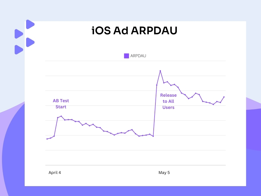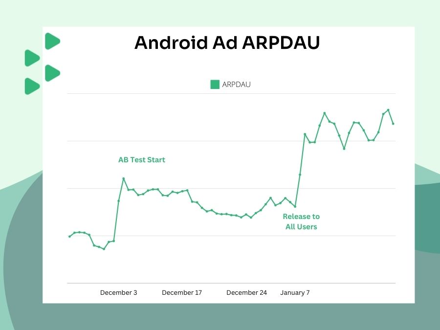 The implementation led to a significant increase in ad revenue share, growing from 6% to 10% of the overall revenue on Android and from 3.5% to 7.5% on iOS. Ad ARPDAU increased by a massive 161% to 260% depending on the platform once the new setup was rolled out to all users. Additionally, eCPM surged by 98% on iOS and by 188% on Android after full implementation. The graph below illustrates the impact of the new ad strategy on ARPDAU over time.
