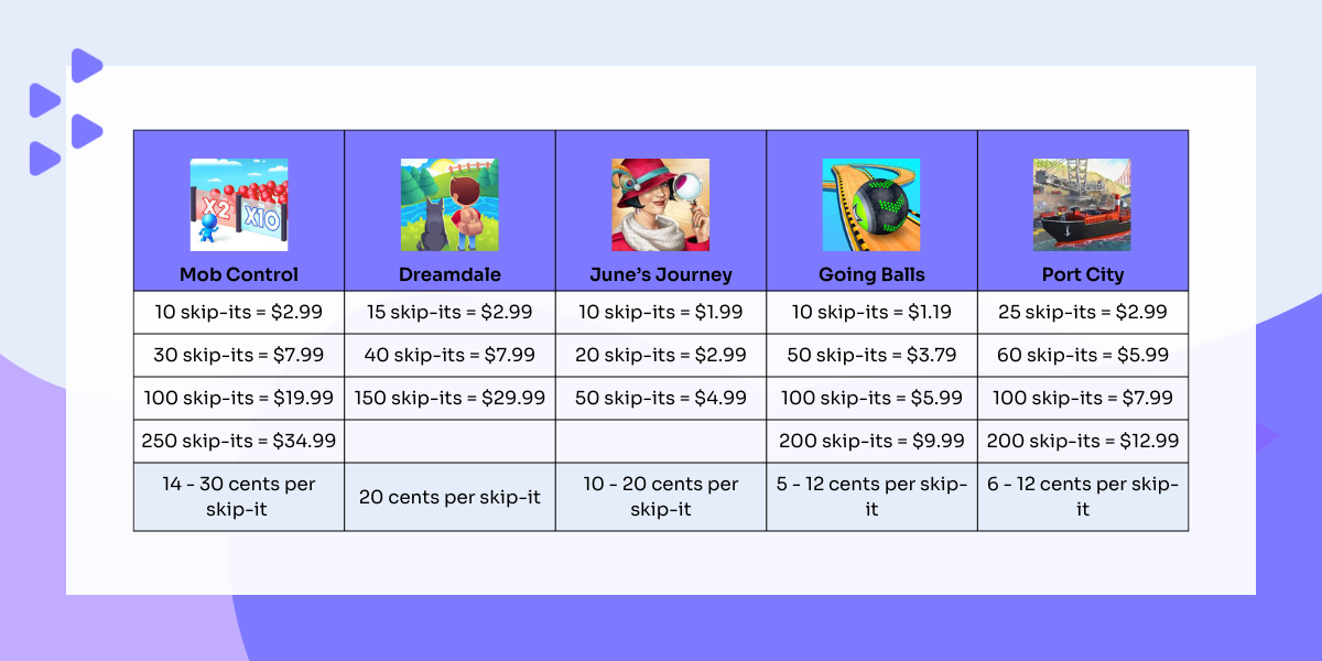 Until skip-its were introduced, there were not many opportunities for users to control their ad-viewing experience in the context of in-app purchase options. Namely, games that show users interstitial ads usually note that any IAP removes forced ads; some even allow users to make a purchase with a single purpose of removing interstitials forever. In most cases, these were one-time purchases that cost anywhere between $0.99 and $3.99.