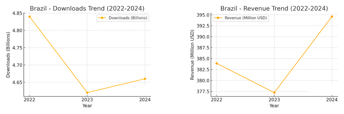 Brazil remains one of the largest mobile gaming markets globally, with billions of downloads annually, but revenue is still catching up to its massive user base. The data shows that Brazil’s total downloads have slightly fluctuated over the past three years, while revenue has only recently started growing again in 2024.