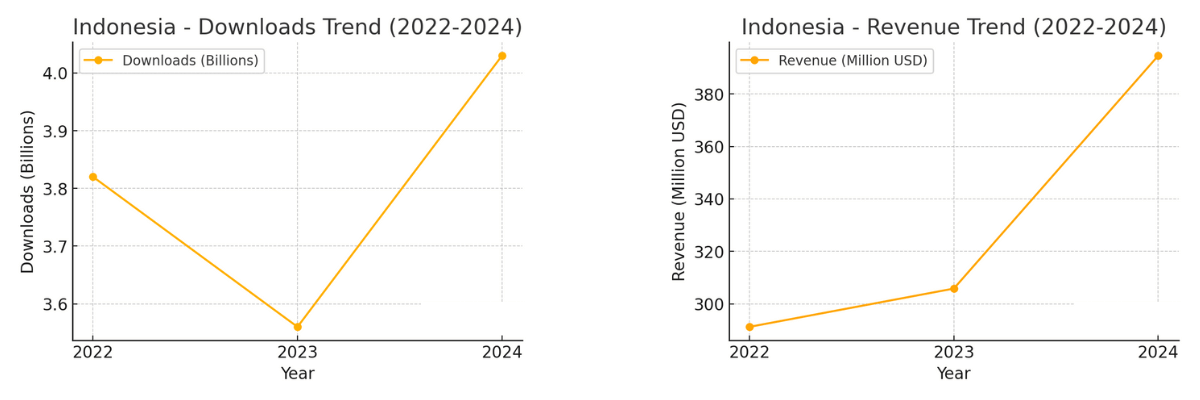 Downloads dipped in 2023 (-6.8%) but rebounded significantly in 2024 (+13.2%). This 2023 slowdown may indicate a brief market saturation or shifts in user acquisition strategies, while 2024’s sharp increase in downloads suggests that new users are entering the ecosystem, possibly due to improved mobile internet access and more aggressive UA campaigns.