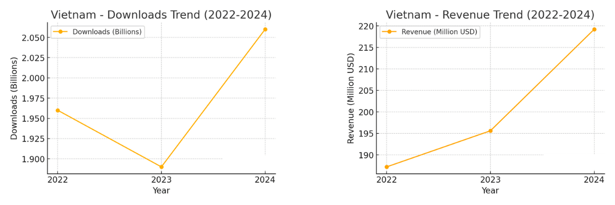 Vietnam has shown consistent growth in mobile gaming engagement, and while IAP revenue is still lower compared to more mature markets, it is steadily increasing. The past three years indicate a strong upward trend in both downloads and revenue, signaling a growing willingness among players to spend on in-game purchases.