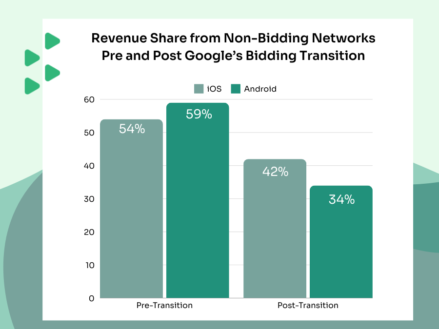 For instance, even post-Google’s shift, we see that non-bidding networks are still generating 42% of iOS revenue and 34% of Android revenue. The implication is clear: overlooking or under-optimizing these networks could lead to a substantial loss in potential revenue.